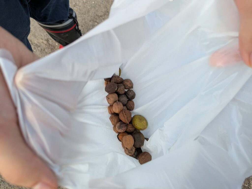 神通川を楽しむ会の高橋剛一郎さんに説明していただき、神通川海岸沿い落ちているクルミを拾いました。拾ったクルミの殻を割り、中身を取り出しました。その後、取り出した中身を使用した料理をみんなでいただきました。